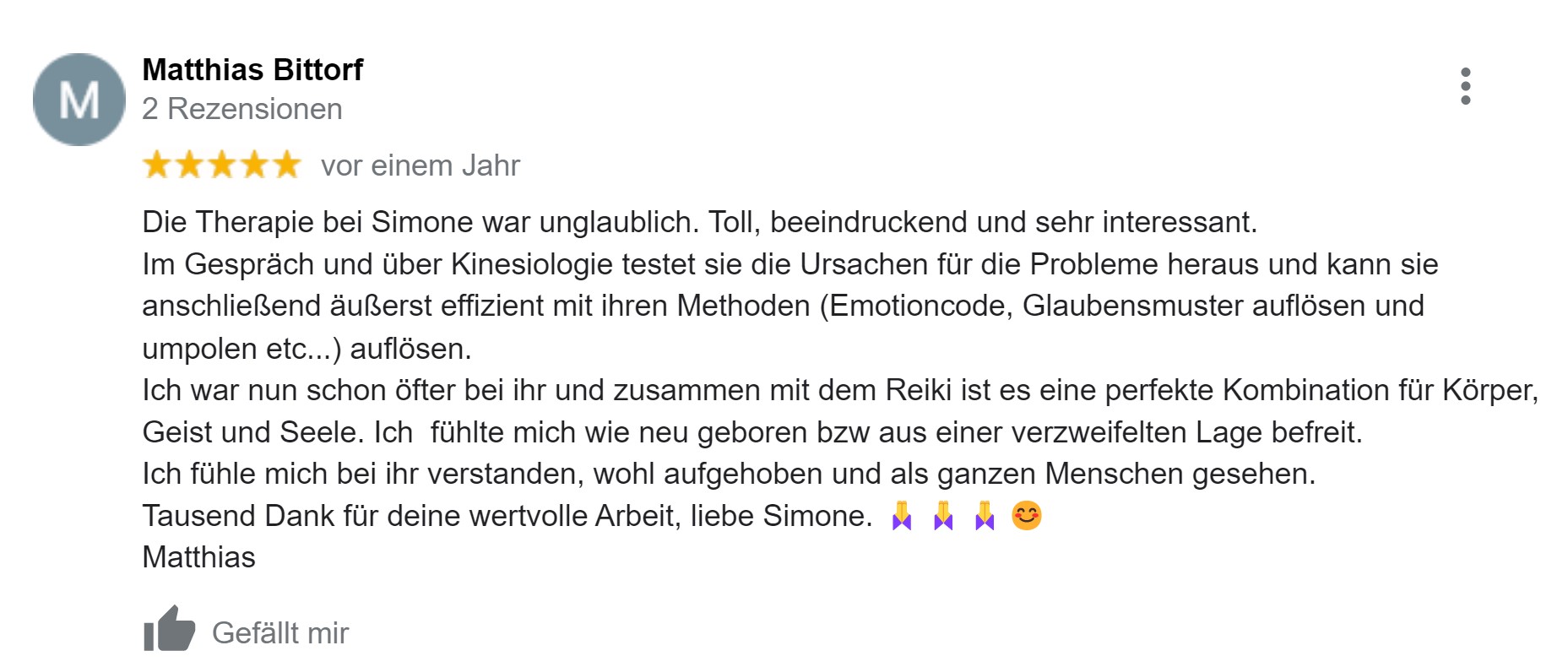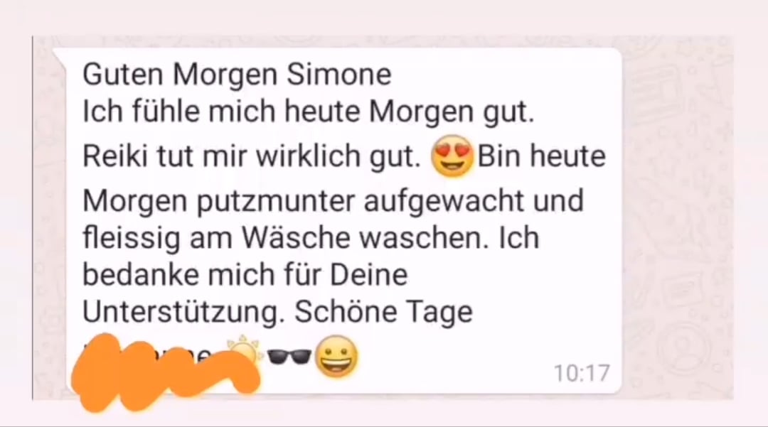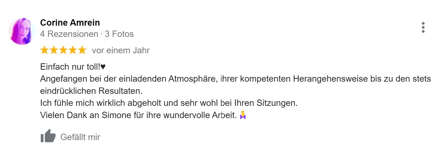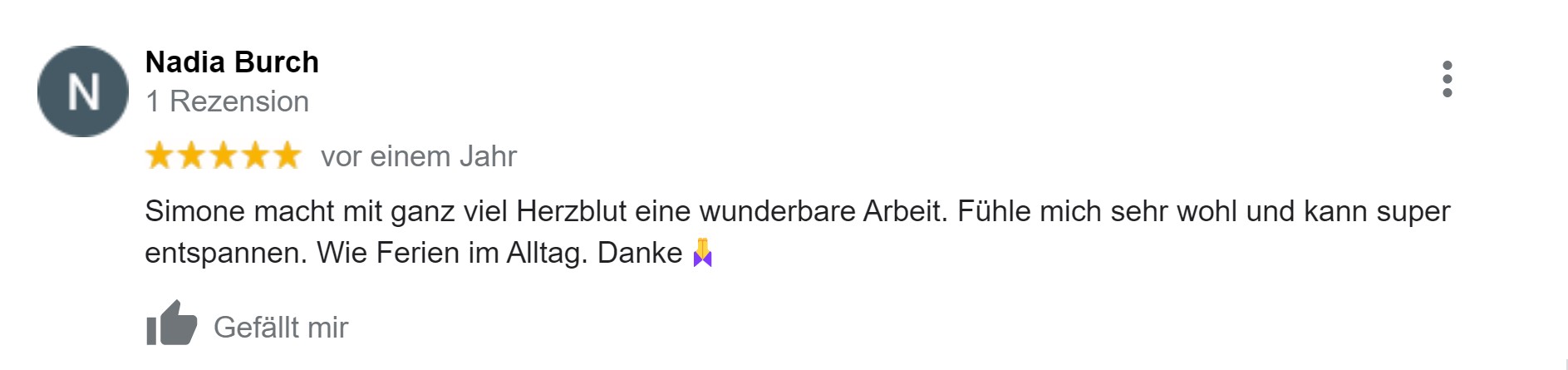 Simone‘s Energiemassage war einfach traumhaft und tiefenentspannend, top und absolut empfehlenswert!! Ich komme wieder! Nochmals DANKE!